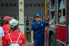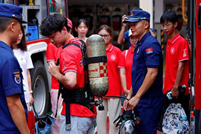 圖為“使命必達(dá)”實(shí)踐團(tuán)在消防員帶領(lǐng)下參觀學(xué)習(xí) 圖為實(shí)踐團(tuán)成員體驗(yàn)穿戴空氣呼吸器