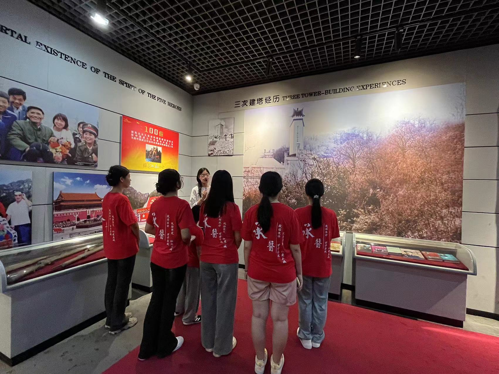 “ 圖卷再現(xiàn)崢嶸,塔下追懷故往 ”追尋陳列館以及紀(jì)念塔足跡。為深刻洞悉狼牙山革命歷史,剖析革命先烈的非凡壯舉,團(tuán)隊(duì)成員緊隨講解員的步伐踱入陳列館。講解員在隨行中介紹館中豐富的歷史遺物與震撼人心的圖像記錄,通過(guò)細(xì)致入微的講述,深刻描繪出革命先輩們不畏艱難險(xiǎn)阻、英勇抗敵的雄渾史詩(shī)。講解員說(shuō)到:“在那烽火連天的歲月里,狼牙山見(jiàn)證了無(wú)數(shù)英勇的八路軍戰(zhàn)士與人民群眾共同抵抗日寇的壯舉 ”、“在這片土地上,村民們與戰(zhàn)士們心手相連,這份堅(jiān)如磐石的群眾基礎(chǔ),正是源自共產(chǎn)黨人不忘初心、牢記使命,全心全意為人民服務(wù)的堅(jiān)定信念。 ”其話語(yǔ)中透露出對(duì)革命歷史的無(wú)限敬仰與對(duì)先烈精神的深刻緬懷,隨著講解的進(jìn)行, 一位小同志深受感染,隨團(tuán)隊(duì)一同參觀。講解結(jié)束后,團(tuán)隊(duì)成員合影留念, 隨后團(tuán)隊(duì)成員依照既定路線,逐級(jí)攀登階梯,追尋紀(jì)念塔足跡。