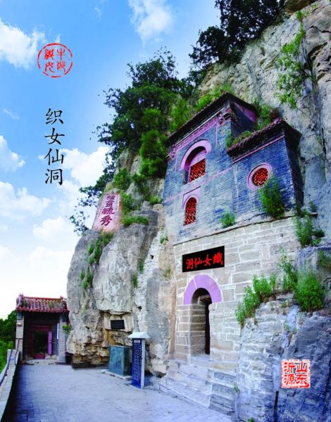 織女洞 自沂源縣城南行10余公里,便到了綠色植被覆蓋下的大賢山東北麓,但見巨石嵯峨、懸崖如削、松柏倒掛、一派旖旎風光。沿山路上行片刻,右側山崖邊有一處小巧的的山門,便是織女洞的院門。門樓內石灰墻壁上,書有唐代詩人杜牧的七言絕句《秋夕》,導引游人步入歷史與神話交織而成的時空隧道:銀燭秋光冷畫屏,輕羅小扇撲流螢。天街夜色涼如水,坐看牽牛織女星。走進織女洞院門,抬眼望去,左側懸崖峭壁缺口處,有一處凌空的高閣前臉鑲嵌其上,下方便是織女洞口。織女洞內部是一座朱門綠窗、青磚灰瓦的二層樓閣,洞高8米,寬7米,長約10米。洞中存有古碑數塊,年代較早的可以上溯到宋代。織女和王母的彩色塑像端坐在第二層上,左側設有織女梳妝臺與寢室;樓閣第二層的前臉上,有一個上圓下方的窗戶,正可讓脈脈含情的織女臨窗端坐,與河對岸的牛郎隔河相望。