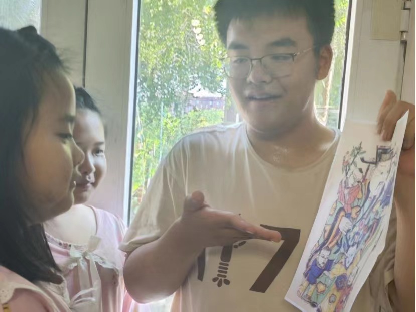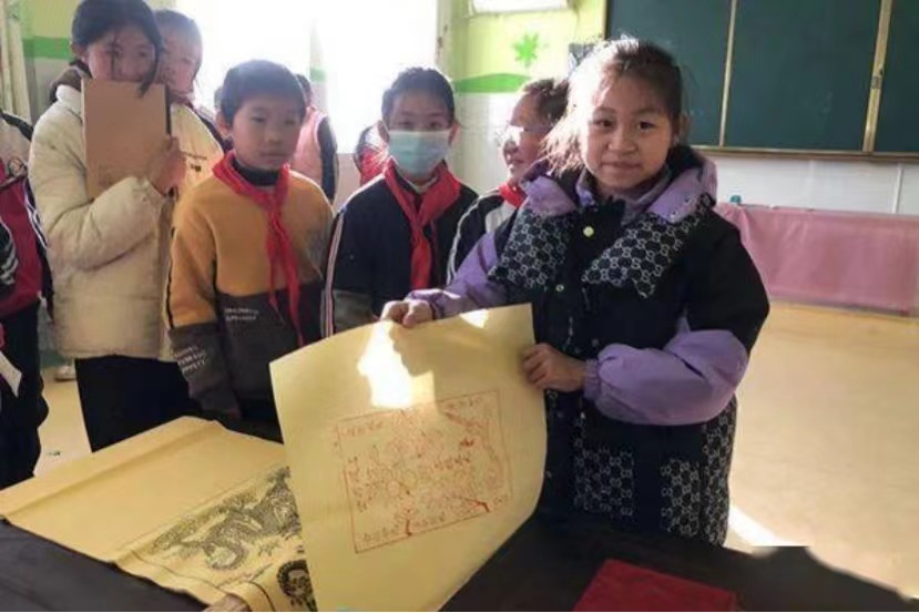 圖為實(shí)踐隊(duì)員向小學(xué)生傳播年畫(huà)的影響