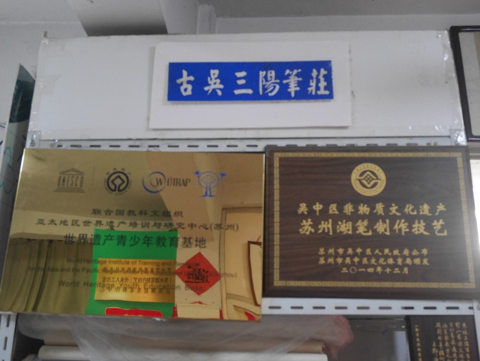 “毛筆的筆尖是十分重要的,寫字的一撇一捺都關(guān)乎筆尖,非常要緊。”倪先生團(tuán)隊(duì)的蘇州湖筆不僅繼承了湖州湖筆優(yōu)良的做工,從浸料、拔毛、整齊、配料至修削等方面更為改進(jìn),更加適應(yīng)了文人畫注重“寫意”,以及筆鋒軟硬適中,彈性適宜,且儲(chǔ)水量大的要求。倪先生的古吳三陽筆莊除了傳承了蘇州人制“蘇州湖筆”的精粹,制作傳統(tǒng)的湖筆(羊毫),還創(chuàng)新制作 “湖筆”“水筆(丹徒、丹陽制作傳統(tǒng))”相結(jié)合的羊狼毫筆。新的品質(zhì)品種也豐富了“蘇州湖筆”的內(nèi)涵。前些年我們?cè)鴺s膺吳中區(qū)頒布的制筆技藝非遺傳承人,以及“非物質(zhì)文化遺產(chǎn)傳承基地”的稱號(hào)。提到了這些創(chuàng)新之處,倪先生驕傲地點(diǎn)了點(diǎn)頭,并期望著蘇州湖筆能夠越做越好,越來越多人能夠了解蘇州湖筆,愛上蘇州湖筆。