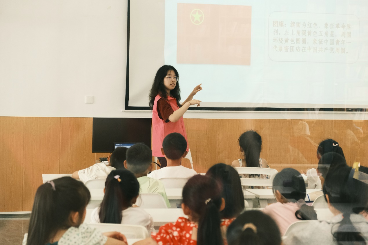 我發現“教學相長”并不是一句空話。我所授的課程是“思想引領”,第一節課便是向學生們介紹祖國的旗幟,包括黨旗、國旗、軍旗、隊旗、團旗。之前我對于這五面旗幟的概念只是一知半解,但通過講授,我重新認識了我們國家的旗幟,每一面旗幟背后都蘊含了我們黨艱苦卓絕的抗爭與奮斗歷程,都飽含了革命先烈對祖國光明未來的憧憬與向往,也只有在了解一面旗幟的誕生過程之后,才能發自內心地對它產生敬畏之心。讓孩子們從小意識到祖國旗幟的內涵并心生敬畏,樹立正確的價值觀,正是這節課的意義所在。