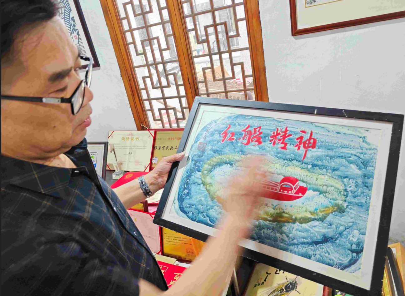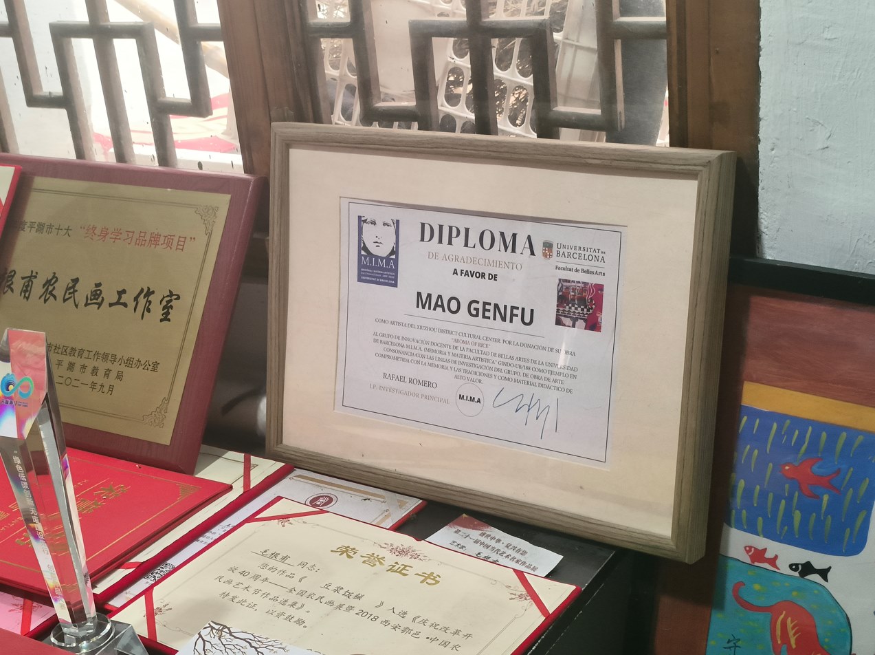 1999年《田園藝術(shù)》畫冊(cè)上有我的《飯香》《守魚》《出窯》三幅作品選登,1999年嘉興日?qǐng)?bào)刊登了農(nóng)民畫作品《飯香》《拋樑》,至今市電視臺(tái)采訪三四十次,2019年全國(guó)豐收節(jié),上臺(tái)畫豐收匾,浙江電視拍攝人民網(wǎng)視頻全國(guó)發(fā)布,農(nóng)民畫作品多次在國(guó)內(nèi)外展出并獲獎(jiǎng),獲獎(jiǎng)證書達(dá)160余次。我們進(jìn)入工作室后毛老師也給我們展示了這些年所獲榮譽(yù),國(guó)內(nèi)國(guó)際大獎(jiǎng)數(shù)不勝數(shù),滿滿一屋子的榮譽(yù)證書,我們真切感受到了毛老師的繪畫底蘊(yùn)。