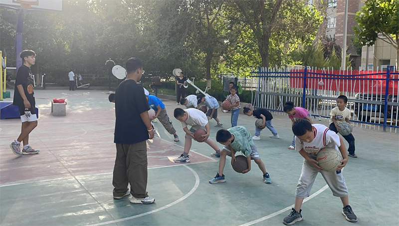 清晨的陽光灑在籃球場上,孩子們的臉上洋溢著朝氣蓬勃的笑容。支教老師們先帶領著孩子們進行了熱身活動,從簡單的拉伸到跳躍,每一個動作都充滿了活力。隨著一聲哨響,便開始了籃球基本技巧的教學,支教老師們根據孩子們的年齡和基礎,制定了有針對性的教學方案。從籃球的基本規則到運球、傳球、投籃的技巧,老師們親身示范,細心指導,讓孩子們逐步掌握籃球運動的要領,盡管孩子們的動作略顯生澀,但他們的熱情如同夏日的熱浪一般高漲。