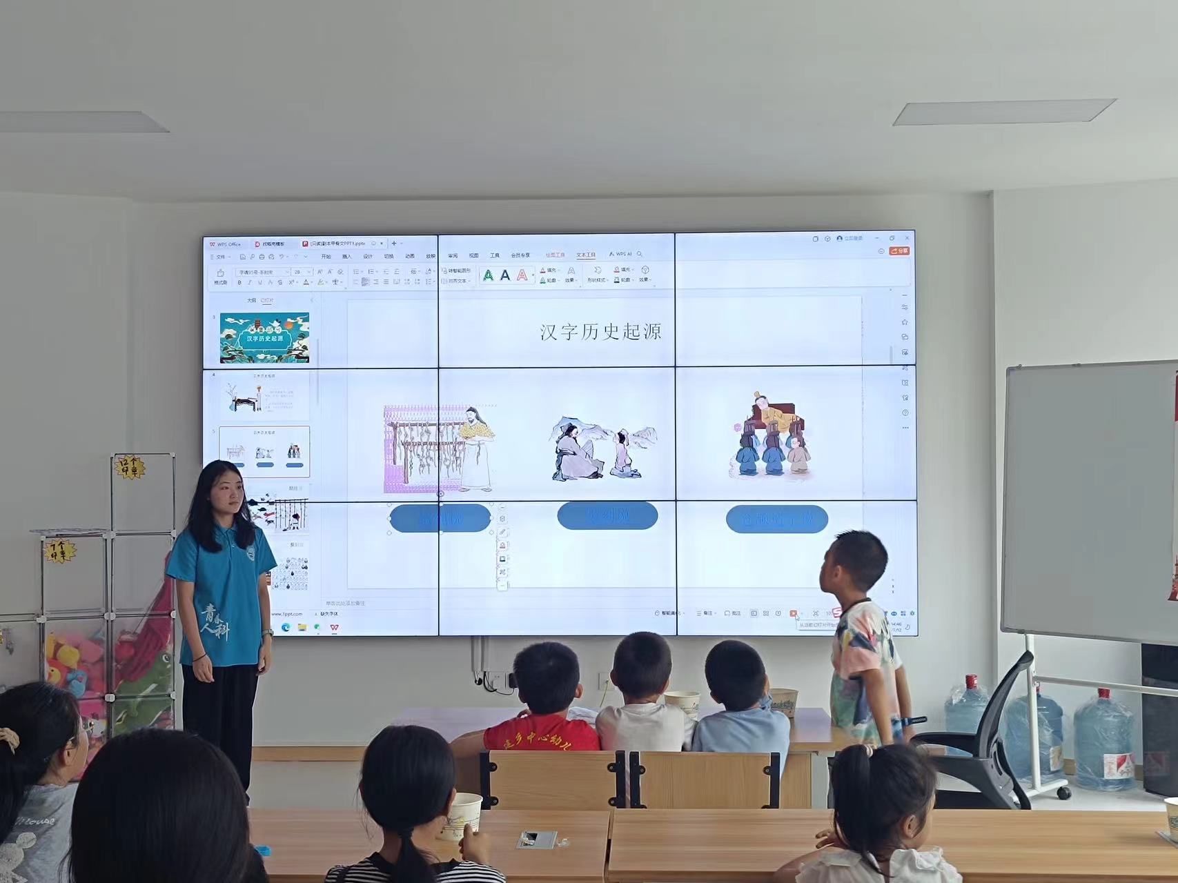 活動當天,實踐團成員以生動的語言和豐富的肢體語言,將孩子們帶入了一個充滿神秘與魅力的甲骨文世界。她們通過一系列甲骨文圖案,每張PPT上都印有一個象形或指事文字,如“日”、“月”、“水”、“火”等,通過有趣的競猜游戲,引導孩子們猜測并理解這些古老文字背后的含義。