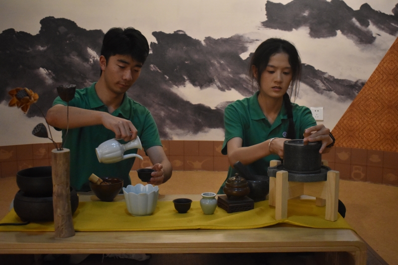 參觀過程中,現場工作人員為實踐團成員們呈現了一場茯茶制作工藝的精湛展示。從剁茶、揀茶到打吊、篩茶,再到熬釉、炒茶、捶茶,每一個步驟都精準而富有節奏感。這一系列復雜的流程,不僅是茯茶制作的關鍵所在,更是匠人心血與智慧的結晶。在工作人員的悉心指導下,實踐團成員盧菲和王凱有幸體驗茯茶的制作過程。盡管整個制作過程繁瑣且要求精細,但兩人卻沉浸其中,樂此不疲。他們不僅深入體會了茯茶制作的技藝,更深刻感受到了茯茶文化的獨特魅力和深厚底蘊。