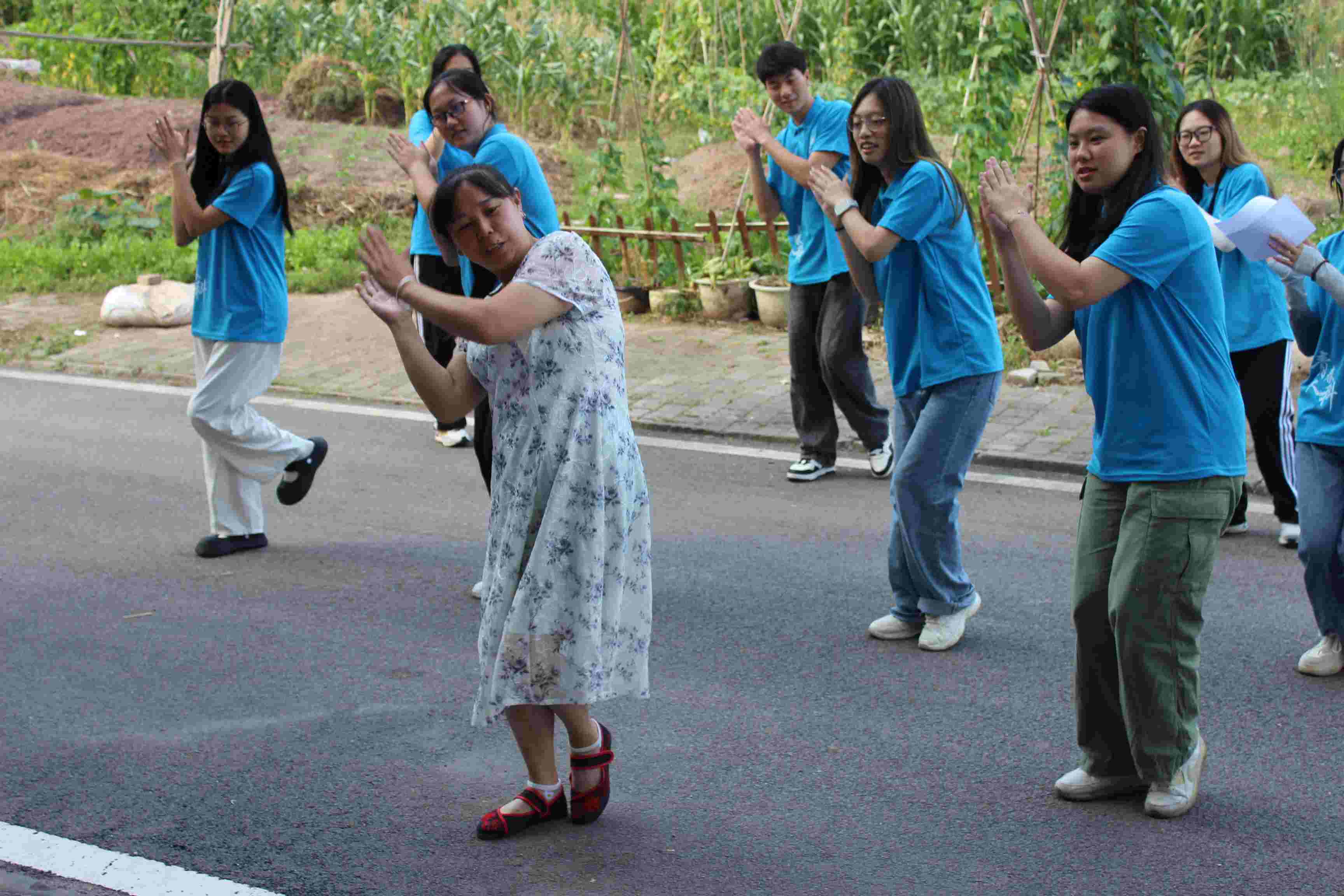 擺手齊共舞,傳承手足間。實踐團邀請傳承人劉長珍進行土家擺手舞教學。土家擺手舞是土家族原始的祭祀舞蹈,集歌、舞、樂、劇于一體,表現土家人生產、生活和征戰場面。實踐團成員跟隨傳承人的動作而舞蹈,體驗土家人日常生活,在手足舞蹈間傳承非遺“擺手舞”。