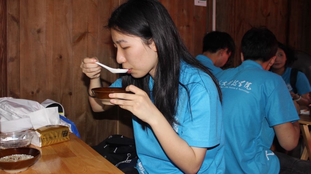 (圖為實(shí)踐團(tuán)成員品嘗非遺土家米米茶 周慶瑩攝)