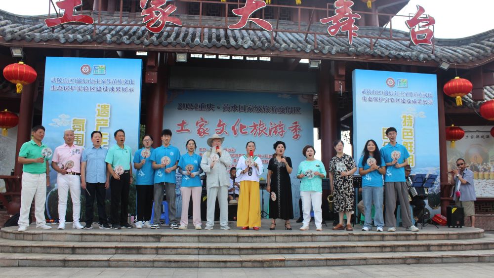 實踐團與當地表演團隊進行共唱共演啰兒調。實踐團與當地表演團隊手持實踐團文創產品共同演唱《太陽出來喜洋洋》等啰兒調經典曲目,向游客展示土家非遺啰兒調獨特文化,宣傳和推廣土家非遺啰兒調,在共同演唱中,激發參與者藝術創造力,為啰兒調宣傳發展帶來新元素和活力。