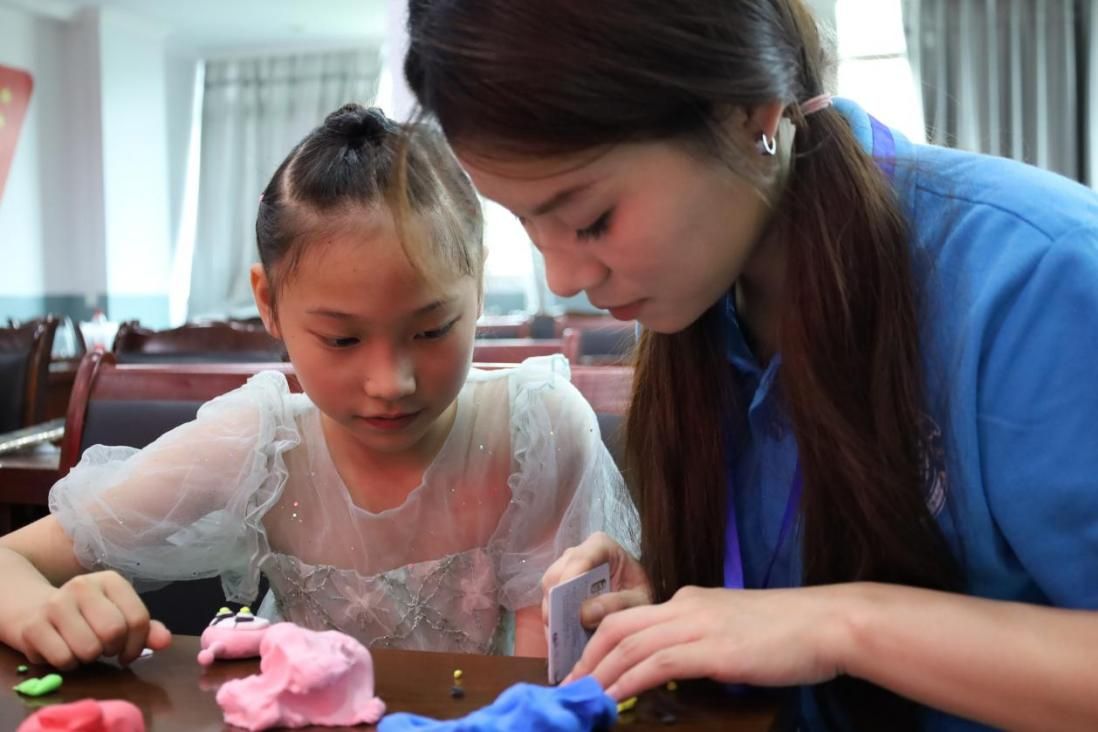圖為團(tuán)隊(duì)成員指導(dǎo)孩子捏彩泥。中國青年網(wǎng)通訊員冉東靈供圖