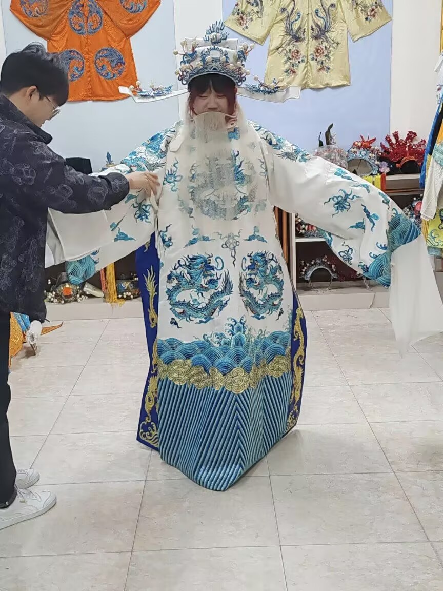 參觀過程中,在劇團工作人員的幫助下,實踐隊員們還親身穿上戲服,拿起道具,深入體驗茂腔文化。戲服與盔帽穿戴繁瑣,并且都有一定的重量。工作人員告訴實踐隊員,演出老師為了達到最好的演出效果,無論春夏秋冬,都會穿戴固定厚度的服飾進行長時間的排練與演出。實踐隊員們不禁為演出老師的敬業(yè)精神與其對茂腔的熱愛感到贊嘆。