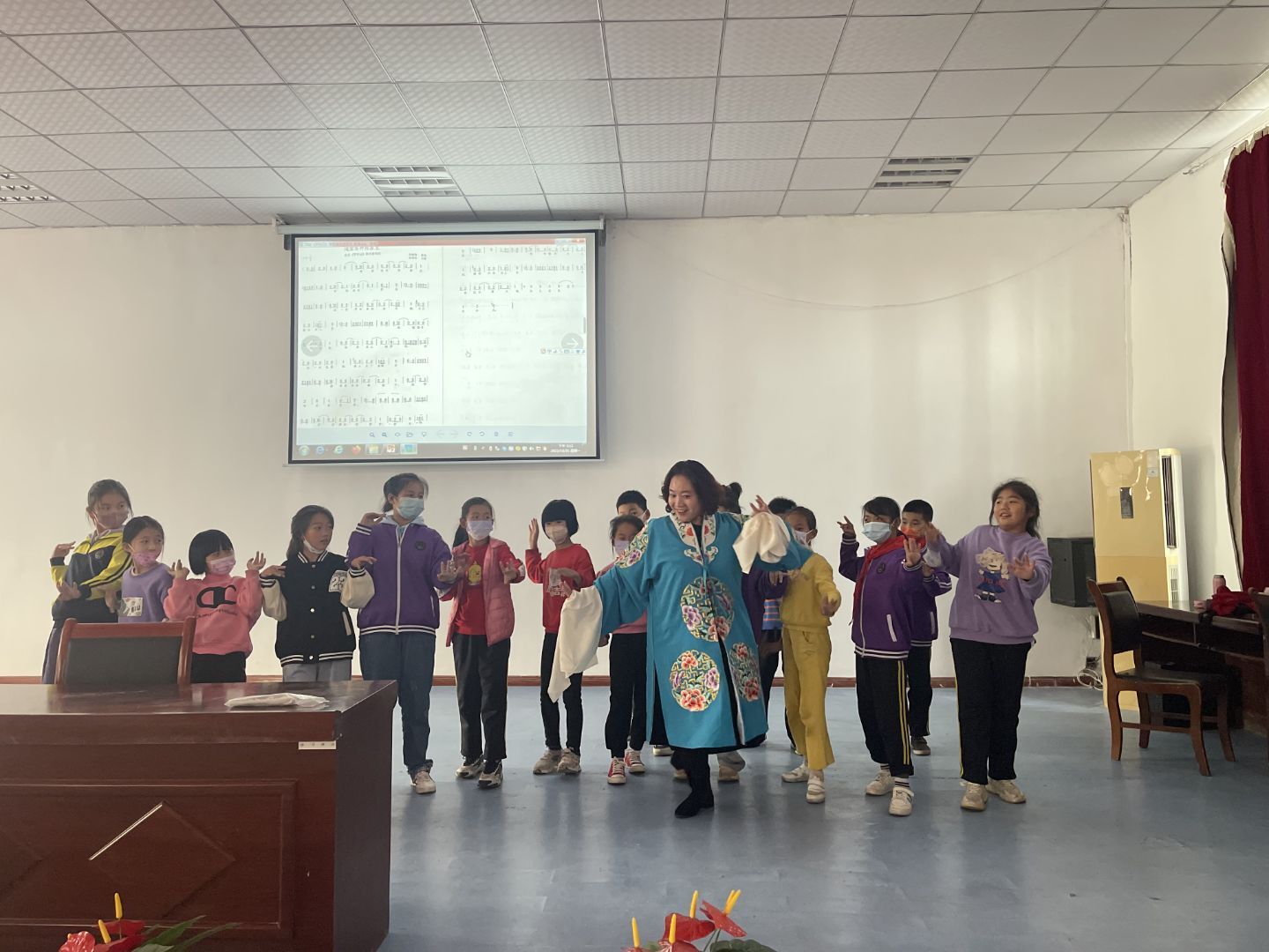 圖為賢繼紅老師到小學進行茂腔教學,傳承茂腔傳統文化。張昕 供圖