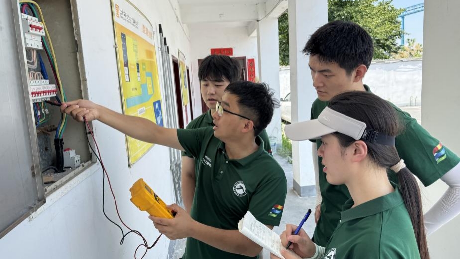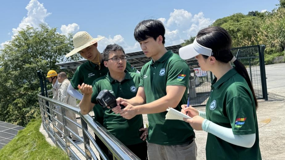 ▲能源組團隊成員測試光伏板性能項目負責人介紹,該分布式光伏項目作為“整縣推進”試點工程,已接入區域能源網,年發電量達150萬千瓦時,相當于減排二氧化碳1200噸。團隊結合《新型電力系統發展藍皮書》分析:“分布式光伏作為能源體系的‘毛細血管’,其與建筑場景的融合正是‘源網荷儲’基層實踐的關鍵一環。”現場可見,在非居住區域,光伏板布局與山體朝向形成科學適配,而在前期調研過程中,團隊成員也發現在人員密度較高的居住區域已嘗試將光伏板作為屋頂遮陽構件,說明太陽能的使用已經初具規模,也初步體現了“光伏建筑一體化”的變化趨勢