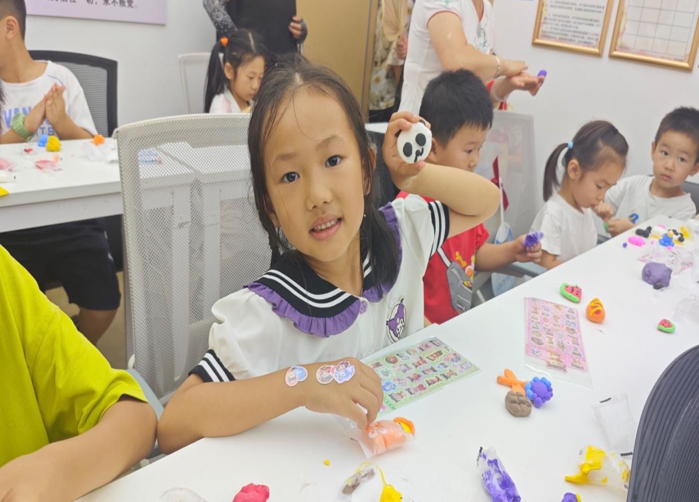 接著來到“粘土DIY手工秀”,隊員們先通過生動的故事導入,引導孩子們暢想自己想創作的形象。隨后,示范了粘土揉、捏、壓的基本技巧,以及如何用貼紙為作品增添細節。拿到材料后,孩子們立刻投入創作:有的黑色粘土捏出小熊的圓腦袋,有的把紅色和綠色粘土組合成西瓜,還有的小朋友合作拼貼小動物,活動室里不時響起“你看我的小熊貓”“這個黏在這里更好看”的雀躍聲,充滿了童真與活力。這不僅讓孩子們在動手過程中鍛煉了精細動作和空間想象力,更在互動中收獲了合作的快樂。