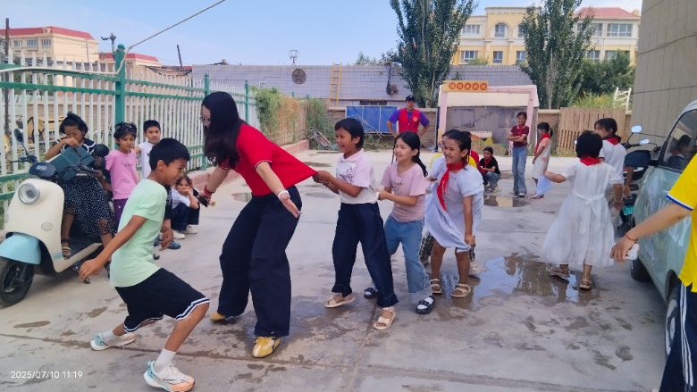 7 月 10 日上午, 新疆政法學院法學院“戈壁育紅心”社會實踐服務團奔赴第三師圖木舒克市四十四團、天福社區舉行了“踐行六個一,童心系家園”的兵團精神與愛國主義教育2025年暑期大學生“三下鄉”社會實踐活動的結營儀式。