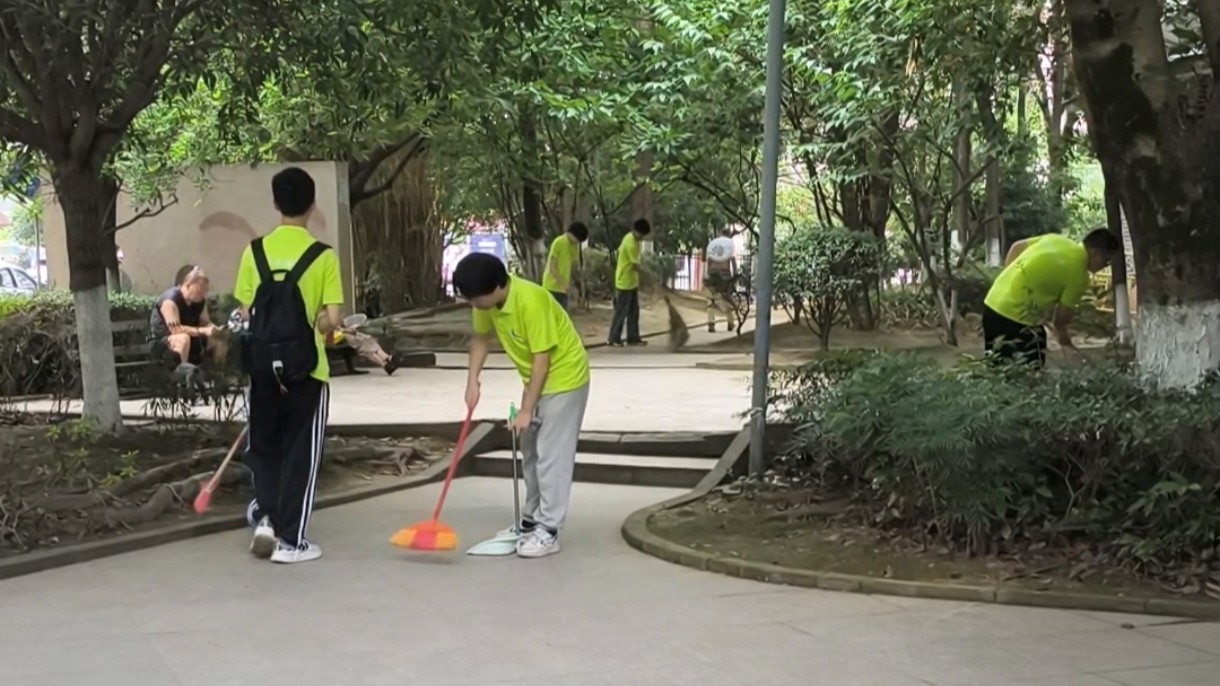 圖為實(shí)踐隊(duì)員為社區(qū)做清潔打掃