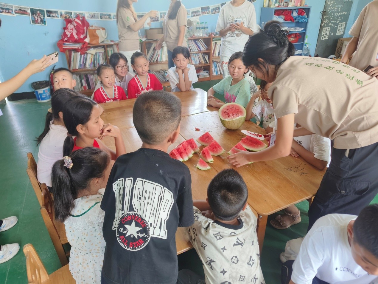 活動(dòng)中,成員邸夢(mèng)蕊為孩子們準(zhǔn)備了一堂防溺水安全教育課。她耐心教授“防溺水手勢(shì)舞”,通過手勢(shì)和口訣,幫助大家掌握防溺水知識(shí),課堂氣氛專注而活躍。課程間隙,一位學(xué)生家長(zhǎng)特意送來清甜的西瓜。這份來自村民的意外心意,不僅為成員們解渴消暑,更讓大家真切感受到當(dāng)?shù)厝罕姷拇緲銦崆楹蛯?duì)支教活動(dòng)的支持與感謝。