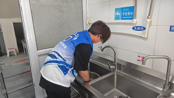 二、衛(wèi)生規(guī)范嚴(yán)落實(shí),守護(hù)健康添保障食品安全與衛(wèi)生是養(yǎng)老院后勤工作的重中之重。廚房區(qū)域,志愿者協(xié)助落實(shí)衛(wèi)生規(guī)范,按“消毒柜”“面案”“菜案”分區(qū)清理操作臺(tái)、檢查消毒柜。他們?cè)谙赐氤嘏再N“溫馨提示:節(jié)約用水(SAVING WATER PLEASE)”,提醒節(jié)約資源。這些細(xì)致行動(dòng),從源頭上守護(hù)老人飲食健康。