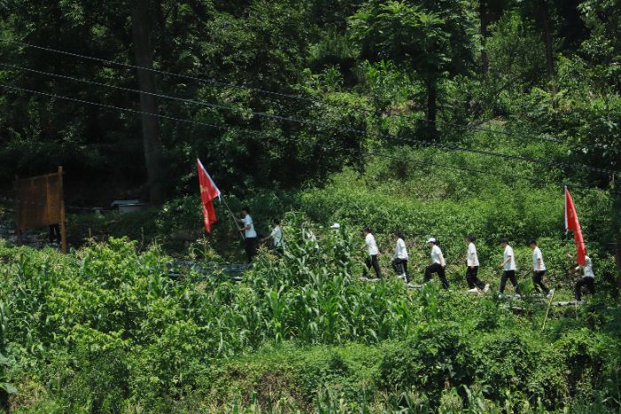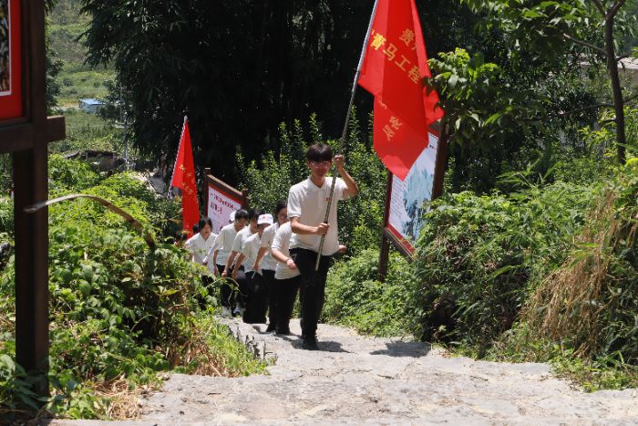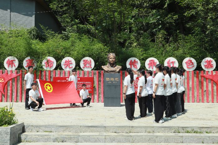 踏山路尋舊蹤,緬先烈立誓言 陸瑞光烈士銅像前,隊員們整理衣襟、嚴整列隊,向這位為中國革命事業獻身的先輩三鞠躬。“我志愿加入中國共產主義青年團……”全體隊員重溫入團誓詞,誓言在山谷中回蕩,既是對革命先輩的告慰,更是傳承紅色基因的莊嚴承諾;122級石階依山而上,實踐隊員們踏上當年紅軍從弄染村轉移的山路,崎嶇的石板被烈日曬得滾燙,隊員們追尋著先輩的足跡前行,汗水浸濕衣衫卻步伐堅定。