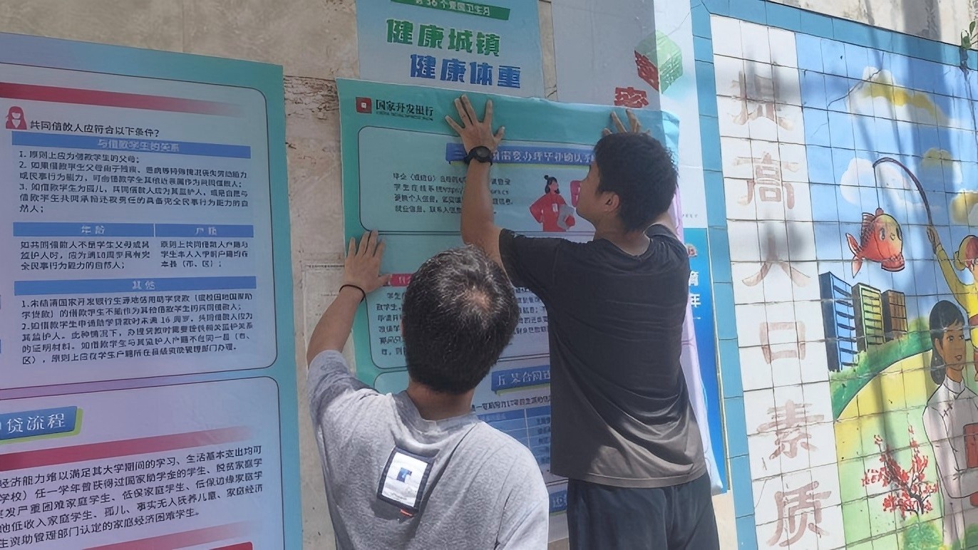 與此同時,另一組隊員們事先與當地政府聯系,到社工站和戒毒所門口張貼海報。隊員們精心打量著海報的高度,小心考慮著左右的寬度,全身心地投入到工作當中,完全忽略了背后的高溫熱浪。這種一絲不茍的態度著實令人敬佩!