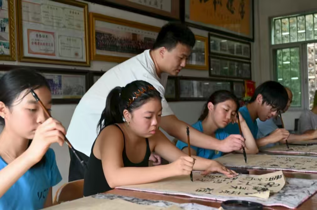支教團今日為同行的美國支教團安排了獨特的一課。徐興遠老師教美國孩子學習了軟筆書法。他先示范握筆姿勢,再介紹隸書行筆的原理。“寫‘橫’要先頓筆,再勻速移動。”他逐個糾正姿勢,握住孩子的手帶他們感受運筆力度。練習幾遍后,孩子們筆下的筆畫逐漸平穩,雖然仍顯稚嫩,卻多了幾分規整。有人舉著自己的作品笑,眼里滿是成就感。
