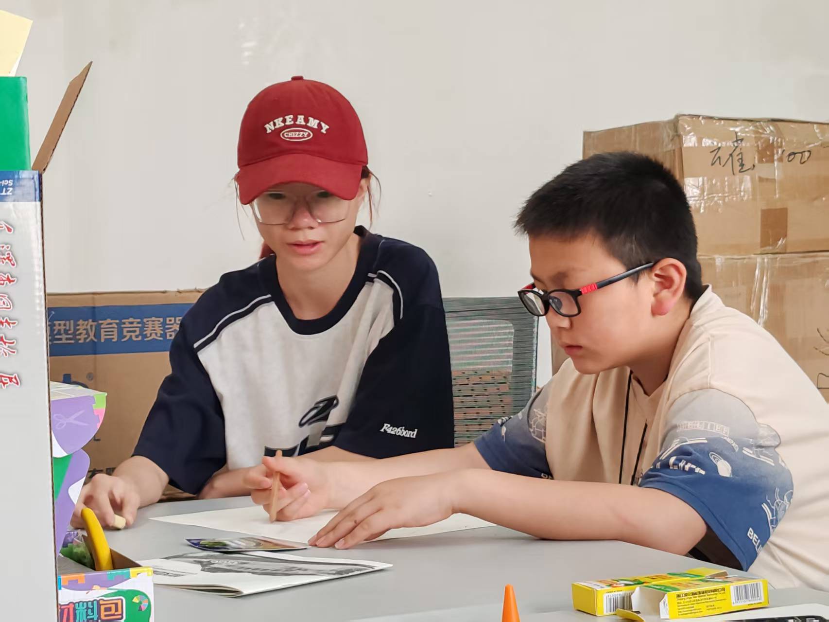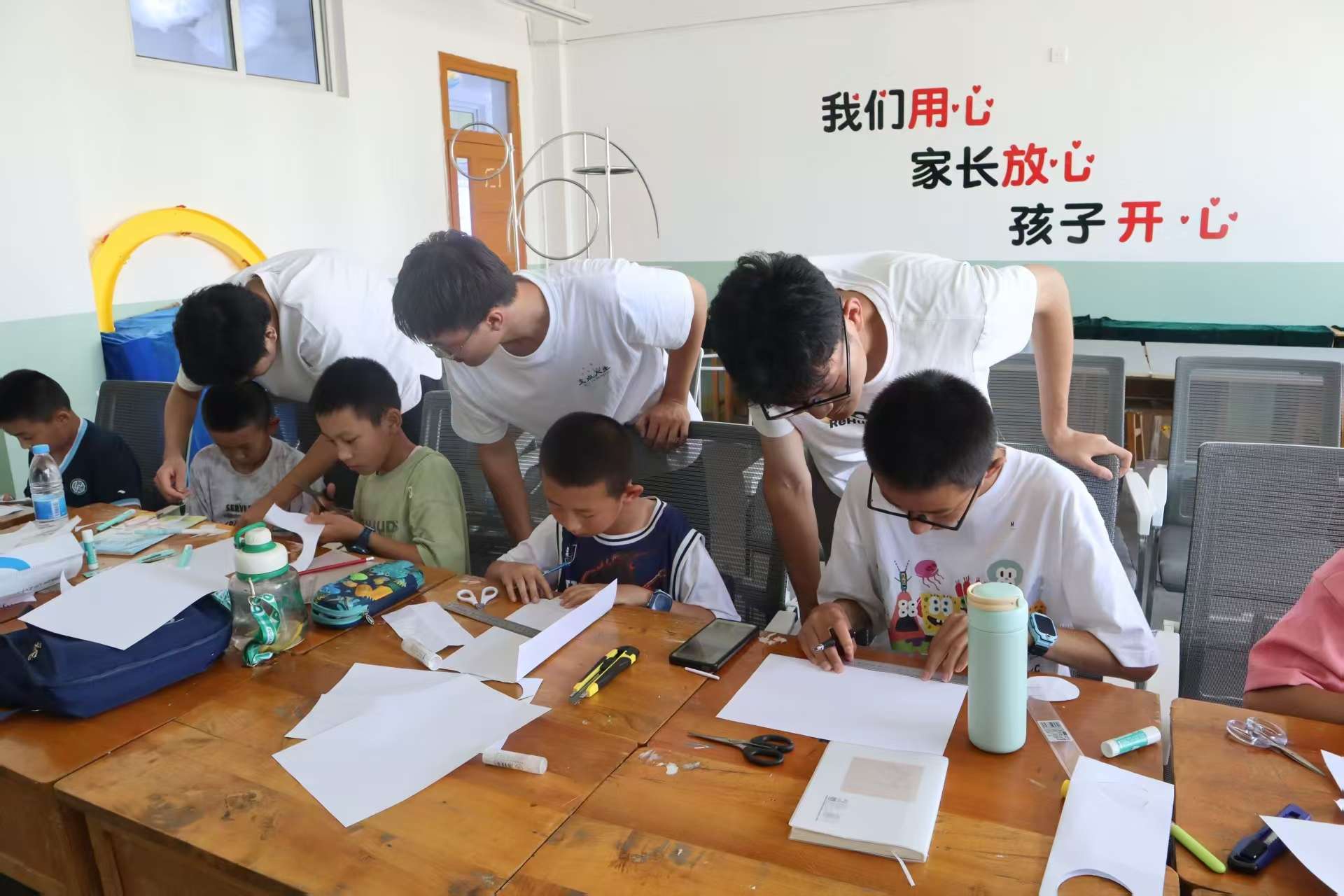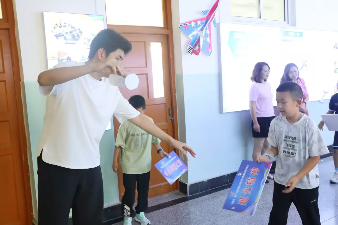 理論課之后 ,老師們別出心裁,用紙飛機作為教具幫助孩子們理解飛行原理。武澤梁等多位老師悉心指導,示范著對稱與平衡的奧秘。孩子們也專注地盯著老師的動作,不斷跟著模仿比對。陽光透過窗戶,照在交疊的手上、散落的彩紙上,也照亮孩子們眼中的專注。