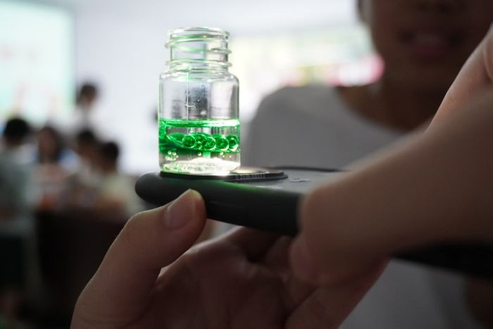理論講解環(huán)節(jié),志愿者用通俗易懂且生動形象的語言向小朋友們講解了實(shí)驗(yàn)原理。他們詳細(xì)地介紹了不同液體之間由于密度差異而產(chǎn)生的分層現(xiàn)象,以及小蘇打與白醋相遇后發(fā)生奇妙反應(yīng),從而產(chǎn)生二氧化碳?xì)馀莸闹R。為了讓“密度”和“化學(xué)反應(yīng)”這些抽象的概念變得更容易理解,志愿者們巧妙地結(jié)合了油和水不相溶、汽水冒泡等生活中常見的現(xiàn)象進(jìn)行類比,同時還通過精彩的動畫演示,將微觀世界的反應(yīng)過程直觀地展現(xiàn)在小朋友們眼前。小朋友們聽得津津有味,眼神專注而充滿渴望,時不時地提出問題與志愿者互動,現(xiàn)場氣氛活躍而熱烈。