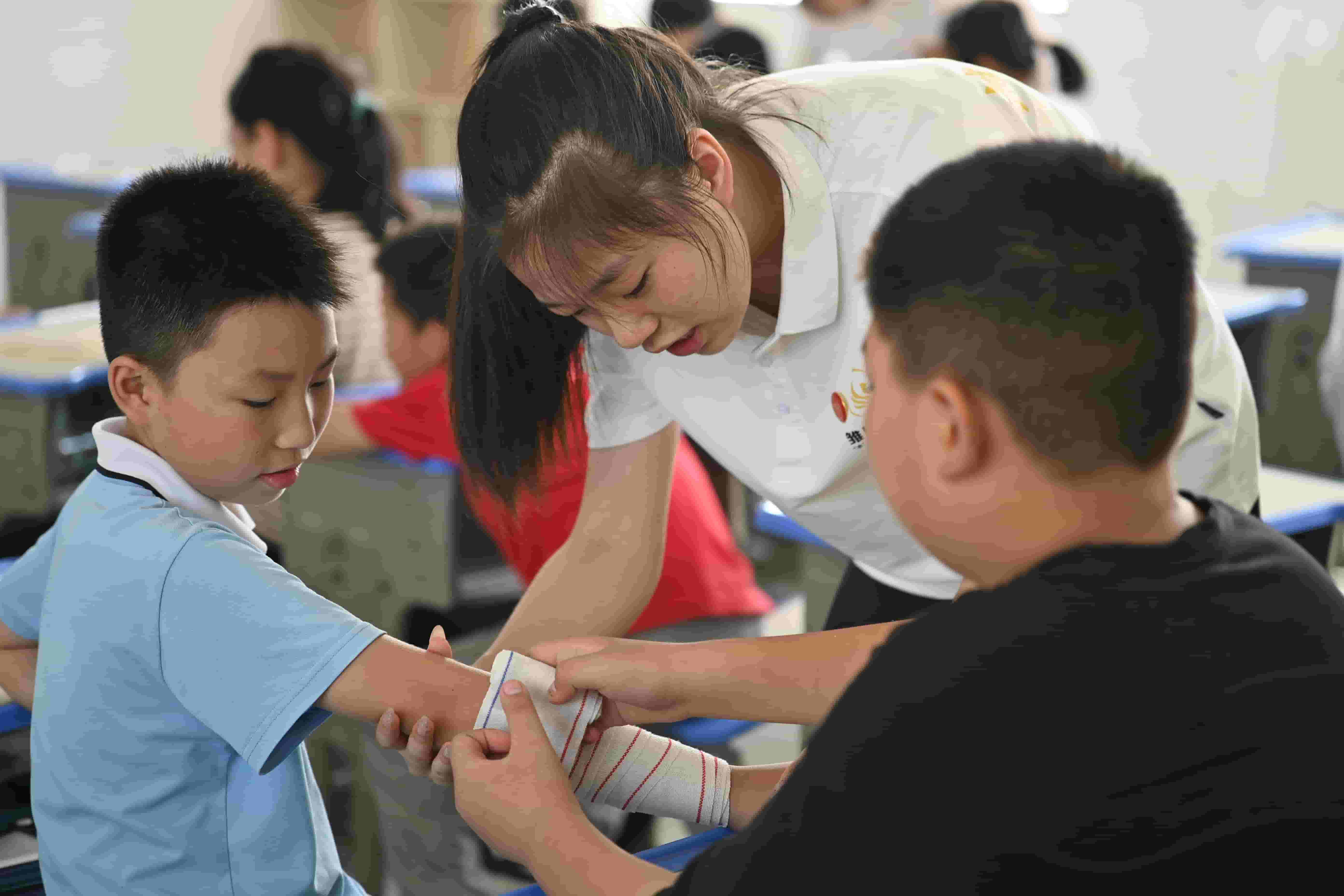 隊(duì)員王楹的醫(yī)學(xué)課上,白色的繃帶在孩子們手中流轉(zhuǎn)。她先在模型上演示,指尖翻飛間,繃帶便穩(wěn)穩(wěn)裹住"傷口","繞圈時(shí)要輕要?jiǎng)颍拖駥?duì)待每一個(gè)需要呵護(hù)的生命"。那一圈圈纏繞的不僅是繃帶,更是"慎重"二字的分量——原來(lái)細(xì)微處的嚴(yán)謹(jǐn),藏著對(duì)生命的尊重。