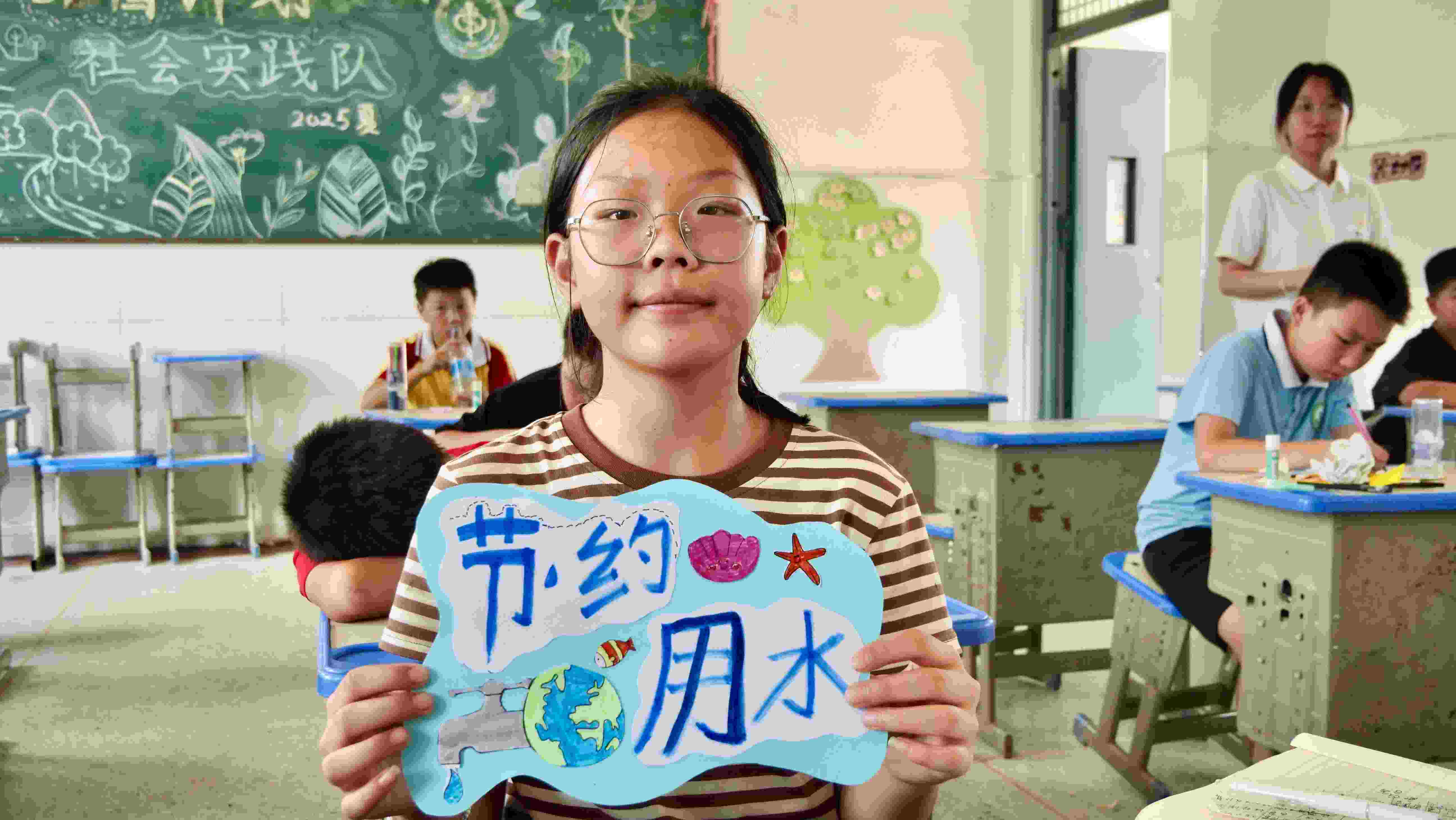隊(duì)員呂語(yǔ)萱的美工課上,彩紙與剪刀的碰撞聲里,流淌著關(guān)于守護(hù)的故事。她講起守水人日復(fù)一日沿著河道巡查的身影,講起干涸土地上裂開的紋路,孩子們的小臉上漸漸凝起專注。當(dāng)護(hù)水承諾卡的輪廓在指尖成形,"節(jié)約用水"四個(gè)字被一筆一劃寫在紙上,仿佛揣著一個(gè)沉甸甸的約定,讓愛水護(hù)水的意識(shí),順著指尖的溫度滲進(jìn)心田。