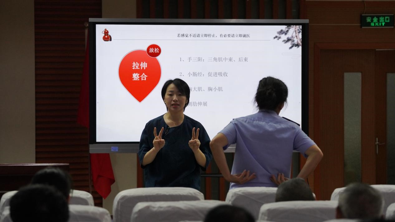 會議室內,著名中醫講師上官華英以“情志診察—用心交流—現場體驗”為主線,串聯起一場生動的健康講座。她從肝臟、脾胃等民警高發問題的器官入手,結合中醫理論提出日常防微杜漸的建議,并現場示范排解壓力的動作。民警們與隊員、講師積極互動,上臺體驗穴位按摩、呼吸調節等技法,會場上洋溢著親切歡樂的氛圍。一位民警感慨:“原來養生可以這么簡單,這些方法下班就能用!”