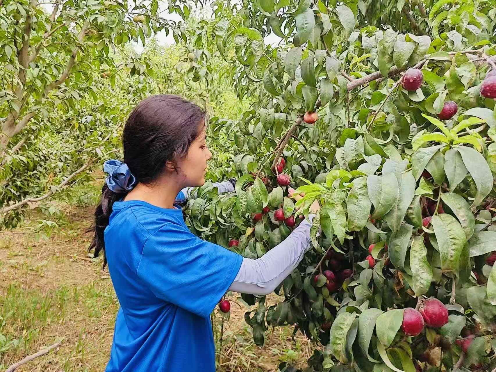 (實(shí)踐團(tuán)成員在在阿瓦提鄉(xiāng)油桃園里摘油桃。王銀秀 攝)