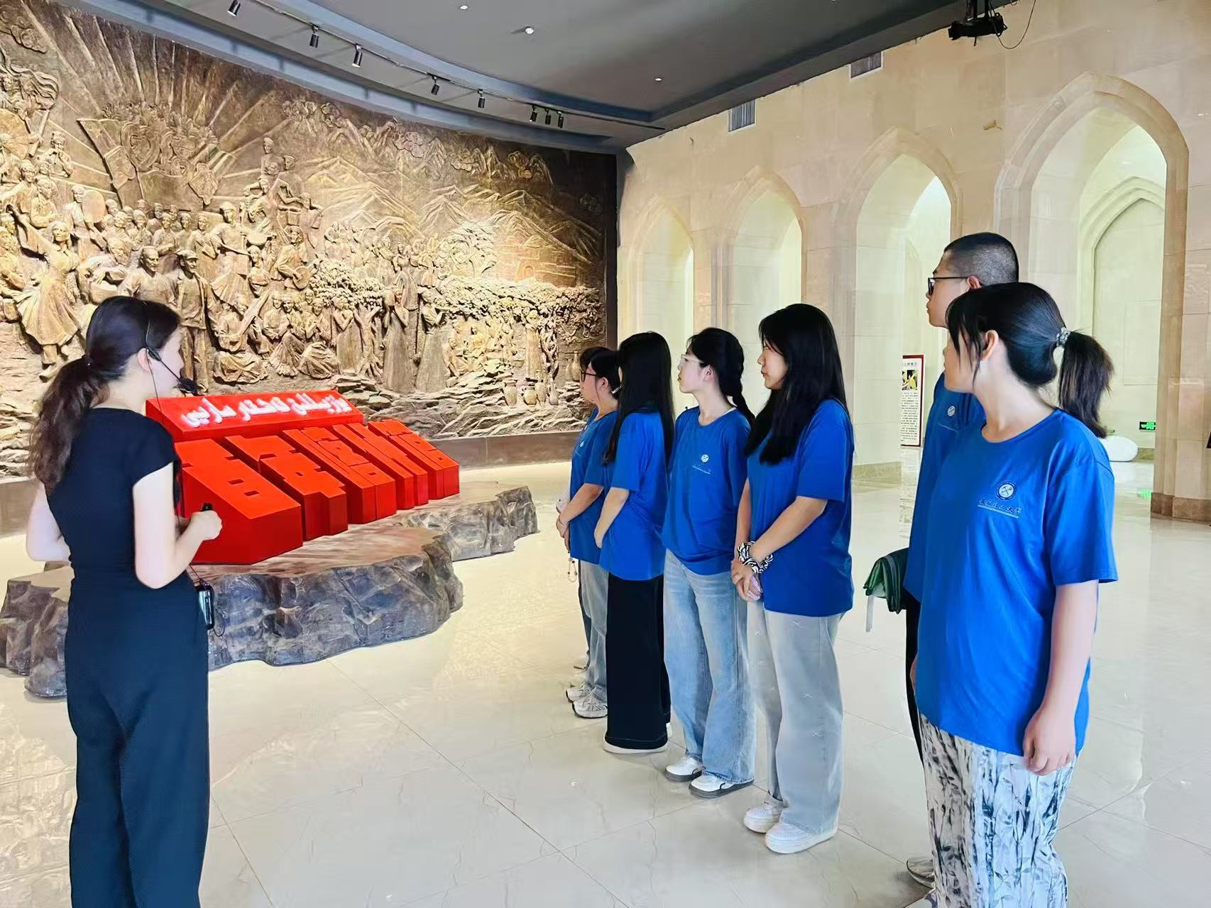 (團(tuán)隊(duì)師生認(rèn)真聆聽講解員介紹百年喀什館。攝影:庫爾班妮薩·圖爾貢)