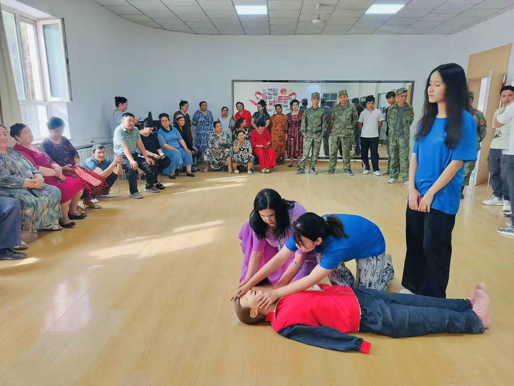 服務(wù)基層一線,彰顯青年擔(dān)當(dāng) 7月14日上午,隊(duì)員們?cè)谛腋T飞鐓^(qū)開展心肺復(fù)蘇急救知識(shí)宣講與實(shí)操演練,通過標(biāo)準(zhǔn)化教學(xué)與一對(duì)一指導(dǎo),有效提升了社區(qū)居民的應(yīng)急救護(hù)能力。社區(qū)主任阿提開木表示感謝說:“這次的活動(dòng)很有意義,這些技能在關(guān)鍵時(shí)候能救人。”在幸福苑社區(qū)的升國旗儀式上,團(tuán)隊(duì)師生與居民共唱國歌,增強(qiáng)了愛國情懷。