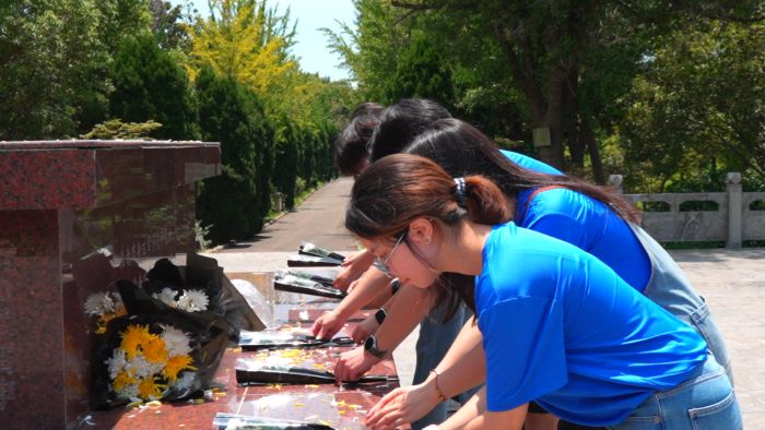 (圖為團隊成員在新四軍紀念林向革命烈士獻花 余晨攝)