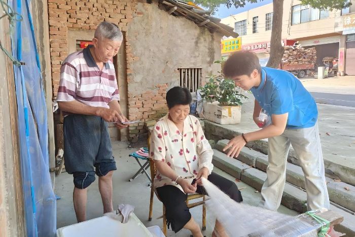 (實(shí)踐團(tuán)成員向農(nóng)戶了解漁網(wǎng)修補(bǔ)等傳統(tǒng)漁業(yè)生產(chǎn)情況并介紹新型銷售模式 韓君威攝)