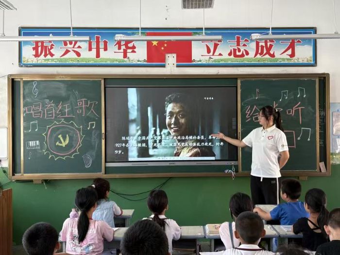 2025 年 7 月 16 日,臨縣留守兒童全托管愛心學校的教室里,山西師范大學“筑夢暖童心,晉師伴成長”育人暖陽教育幫扶隊,在這里鋪開了一場“唱支紅歌給黨聽”的主題活動,讓紅歌的旋律牽著童心,在光影與歡歌里,悄悄播下愛國的種子。
