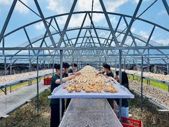 盧經理帶領實踐隊成員進入猴頭菇大棚,剛掀開棚簾,一股帶著濕潤感的菌香撲面而來。盧經理向隊員們介紹起猴頭菇的培育過程:菌袋制作的原料配比——接種后的溫濕度調控——成熟采摘的判斷標準。隊員們圍在一旁近距離觀察猴頭菇的生長狀態,有隊員問起猴頭菇不同生長階段的照料重點,有的好奇病蟲害怎么防治。盧經理為隊員們一一耐心解答,還拿起成熟的猴頭菇示范辨別品質的方法。這場大棚里的“實踐課”,讓同學們對猴頭菇種植有了更鮮活的認知,也真切感受到現代農業技術的力量。
