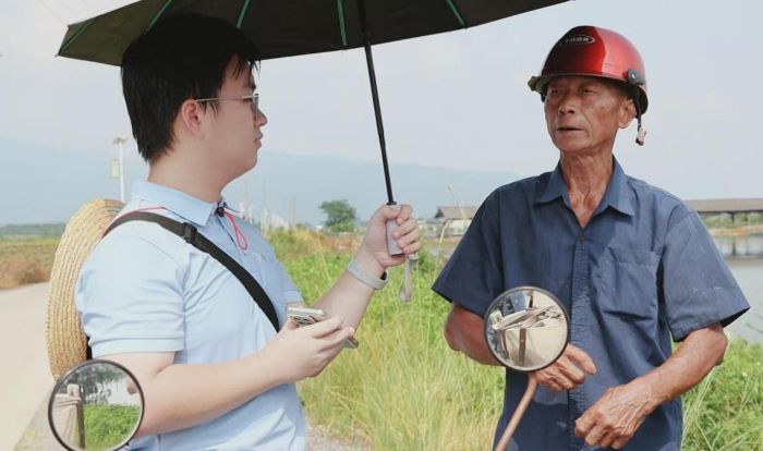 圖為肇慶學(xué)院“芡”途似錦突擊隊(duì)隊(duì)員采訪當(dāng)?shù)卮彘L(zhǎng)。賴冰慧供圖
