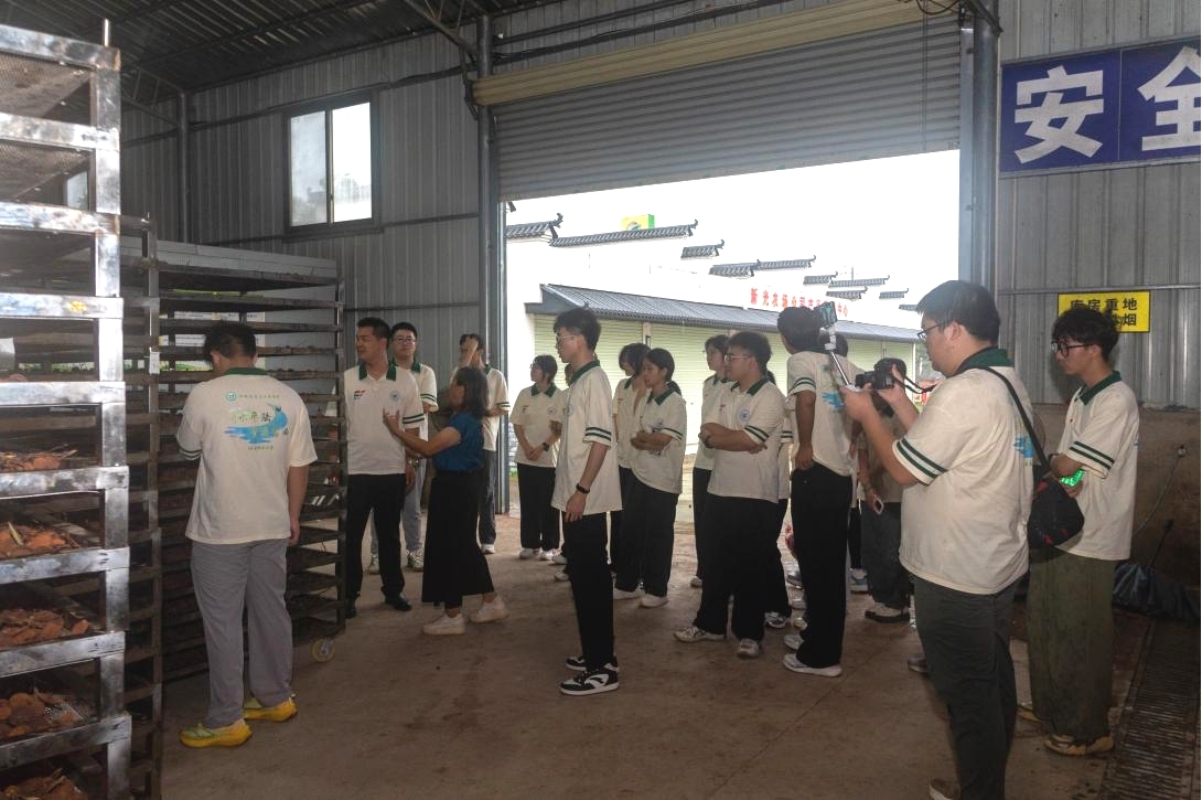 見證荔枝“從田間到舌尖”的蛻變 隨后,實踐團在負責人引導下探訪生態園荔枝加工區。加工區內,清洗、分揀、烘干、包裝等流水線有序運轉,新鮮采摘的桂味荔枝經標準化處理后,被加工成荔枝干、荔枝蜜餞等產品。負責人介紹,加工區的建立打破了“鮮果依賴即時銷售”的局限,通過延長產業鏈提升了農產品附加值,同時采用低溫烘干等技術保留營養成分,契合綠色食品加工理念。“這些加工產品銷往全國,去年帶動周邊50多戶農戶增收。”在加工區展示架前,團隊成員看到包裝精美的荔枝衍生品,直觀感受到綠色農業從“田間”到“舌尖”的全鏈條發展,對“以加工促增值、以品牌拓市場”的綠色產業邏輯有了更清晰的認知。