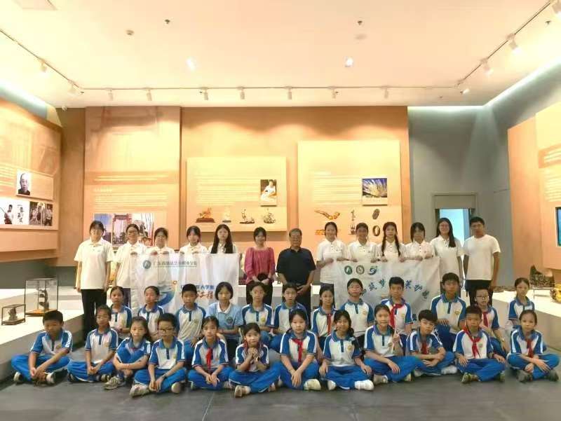 圖為林余松青老師、共青團甲子鎮委員會書記林曉珊、星愿筑夢實踐隊全體隊員和甲子鎮中心小學學生于廣東省嶺南美術館(陸豐市甲子文化藝術中心)貝雕展廳合影。