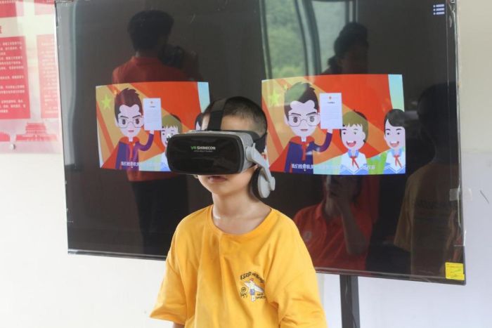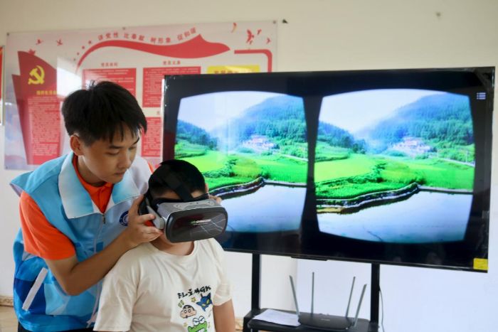 圖為學生們戴著VR眼鏡看家鄉(xiāng) 郭佳晨攝。