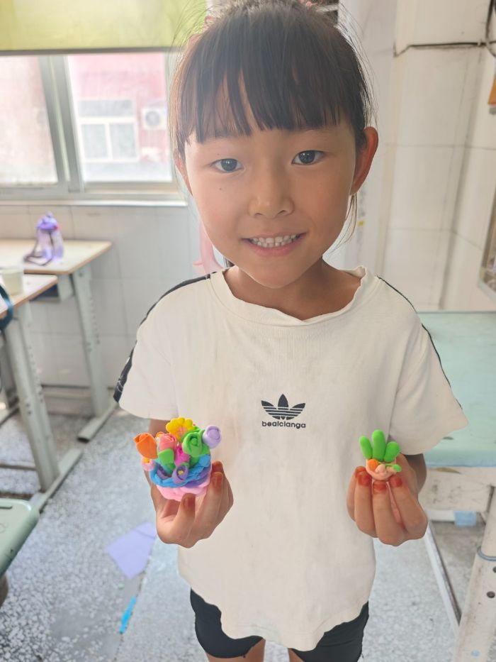 指尖魔法·黏土塑夢顯童真“用黏土捏盆栽,讓花朵在指尖絢爛綻放。”在黏土手工課上,五彩的黏土在孩子們手中翻滾、揉捏、拼接,逐漸化作五顏六色的花朵、花團(tuán)錦簇的花籃、茂密繁盛的盆栽……隊(duì)員們耐心示范技巧,鼓勵(lì)孩子們大膽想象。當(dāng)作品一一陳列,教室里仿佛成了迷你藝術(shù)展,孩子們驕傲地展示自己的作品,眼里溢滿了喜悅與驕傲。
