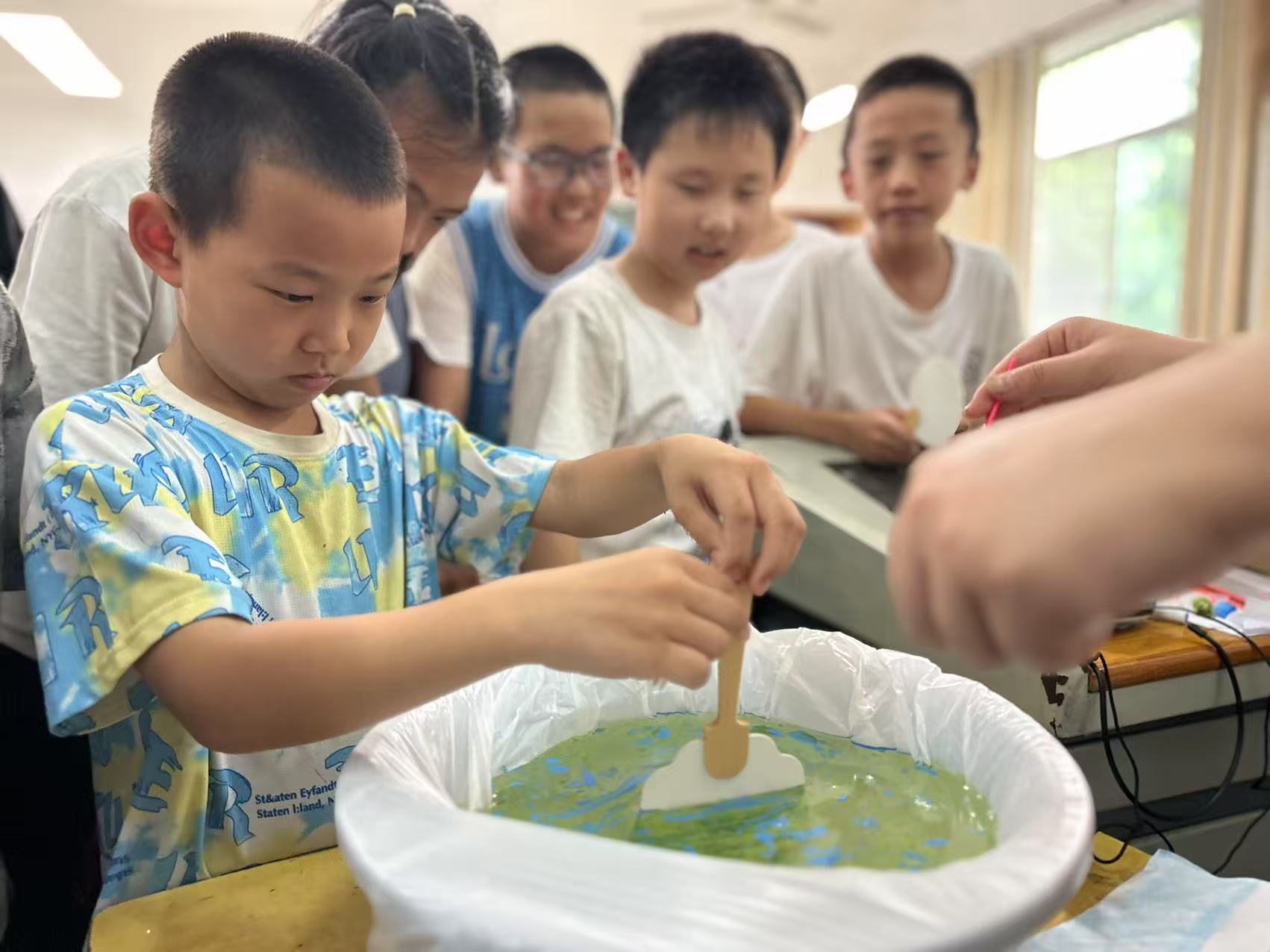 課堂上,支教老師田海露通過演示和講解,讓孩子們了解大漆工藝“百里千刀一斤漆”的珍貴歷史。孩子們用滴管將顏料滴入水中,用竹簽撥動暈染,再將扇面浸入水中轉(zhuǎn)印圖案,創(chuàng)作出獨(dú)一無二的漆扇。“我的扇子像彩虹一樣!”學(xué)生鄢紫嘉舉著作品興奮地說。