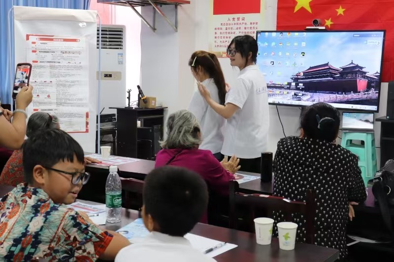 活動現場,實踐團創新采用“情景模擬+趣味教學”模式。一名成員生動演繹氣道梗阻患者的危急狀態,真實還原呼吸困難等緊急情形,吸引在場群眾關注。另一名成員則是結合“石頭剪刀布”等通俗易懂的趣味口訣,將復雜的急救操作要點進行拆解,通過規范的動作演示與細致入微的理論講解,將抽象的急救知識轉化為直觀易懂的實踐技能,讓群眾能夠快速掌握要領。