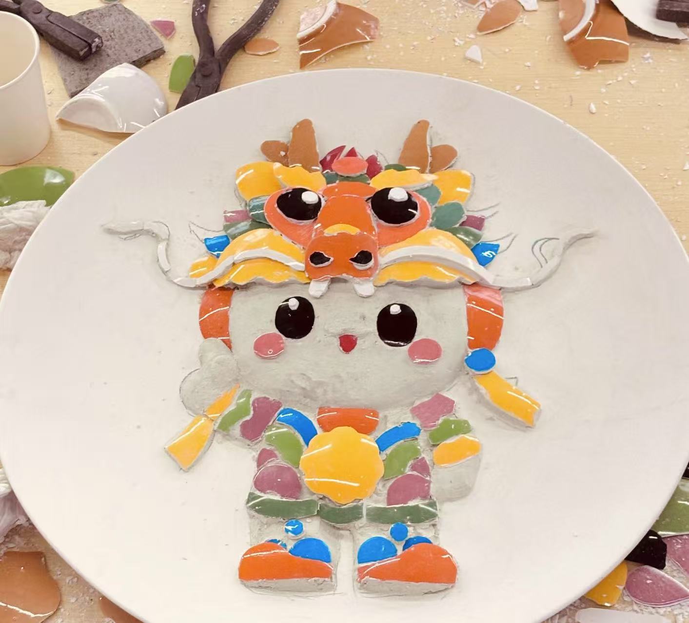 粘貼環節,遵循老師傳授的技法,以專用粘合劑固定瓷片,從阿瓷頭部龍飾開始,細致排布,確保瓷片貼合且色彩過渡自然,逐步完成身體、服飾等部分,讓阿瓷形象在瓷片拼接中鮮活呈現。