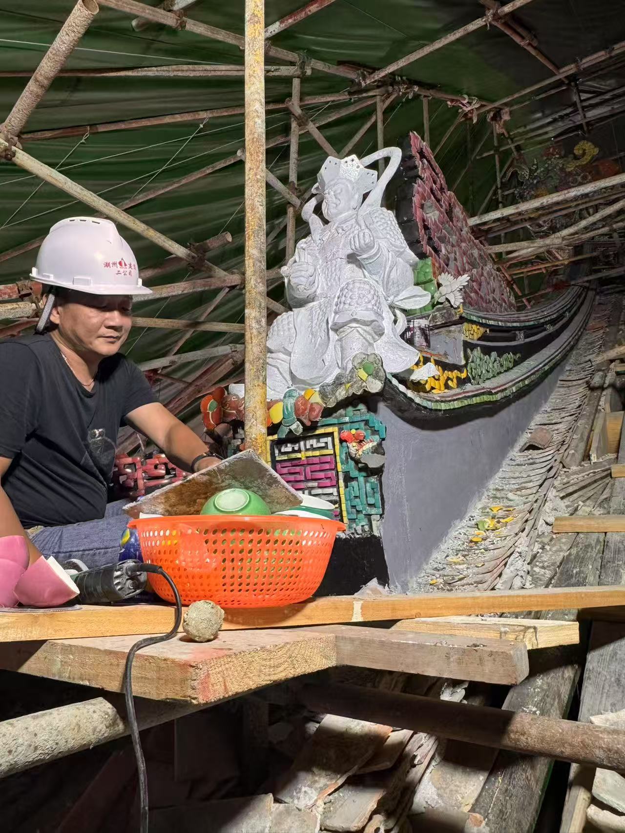 許名泰老師則提到:“每當聆聽恩師講述他們當年學藝的艱辛歷程,我都不禁為之動容。在那個資源匱乏的年代,前輩們只能靠著反復揣摩、獨自鉆研來精進技藝。相比之下,我深感幸運能成長在這個信息發達的時代--豐富的嵌瓷資料觸手可及。2013年我隨父親登上修繕的古建筑屋頂,親眼目睹盧老制作嵌瓷的場景:陽光下,五彩瓷片在他手中仿佛被賦予了生命,那一刻,這顆熱愛嵌瓷的種子便在我心中生根發芽。”
