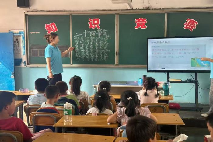 當?shù)湍昙壵n堂的序幕緩緩拉開,志愿者們化身為“時光的講述者”,帶領孩子們漫步于二十四節(jié)氣的長卷之中。從“清明時節(jié)雨紛紛”的煙雨朦朧,到“小荷才露尖尖角”的夏日初綻,再到“霜葉紅于二月花”的深秋絢爛,志愿者們以靈動鮮活的語言為孩子們勾勒四季的輪廓。春分時蝴蝶翩躚、夏至時蛙聲陣陣、秋分時稻浪翻滾、冬至時雪花輕舞,每個節(jié)氣都折射著自然與時光交織的智慧。孩子們屏息凝神,仿佛跟著節(jié)氣的腳步,走過山野田間,觸摸到大地跳動的脈搏,在流轉的歲月里讀懂自然的密語。