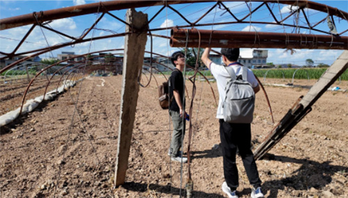 圖為實踐團成員走訪當地種植戶記錄現有大棚結構老化等使用痛點及改造期望。供圖 周子涵