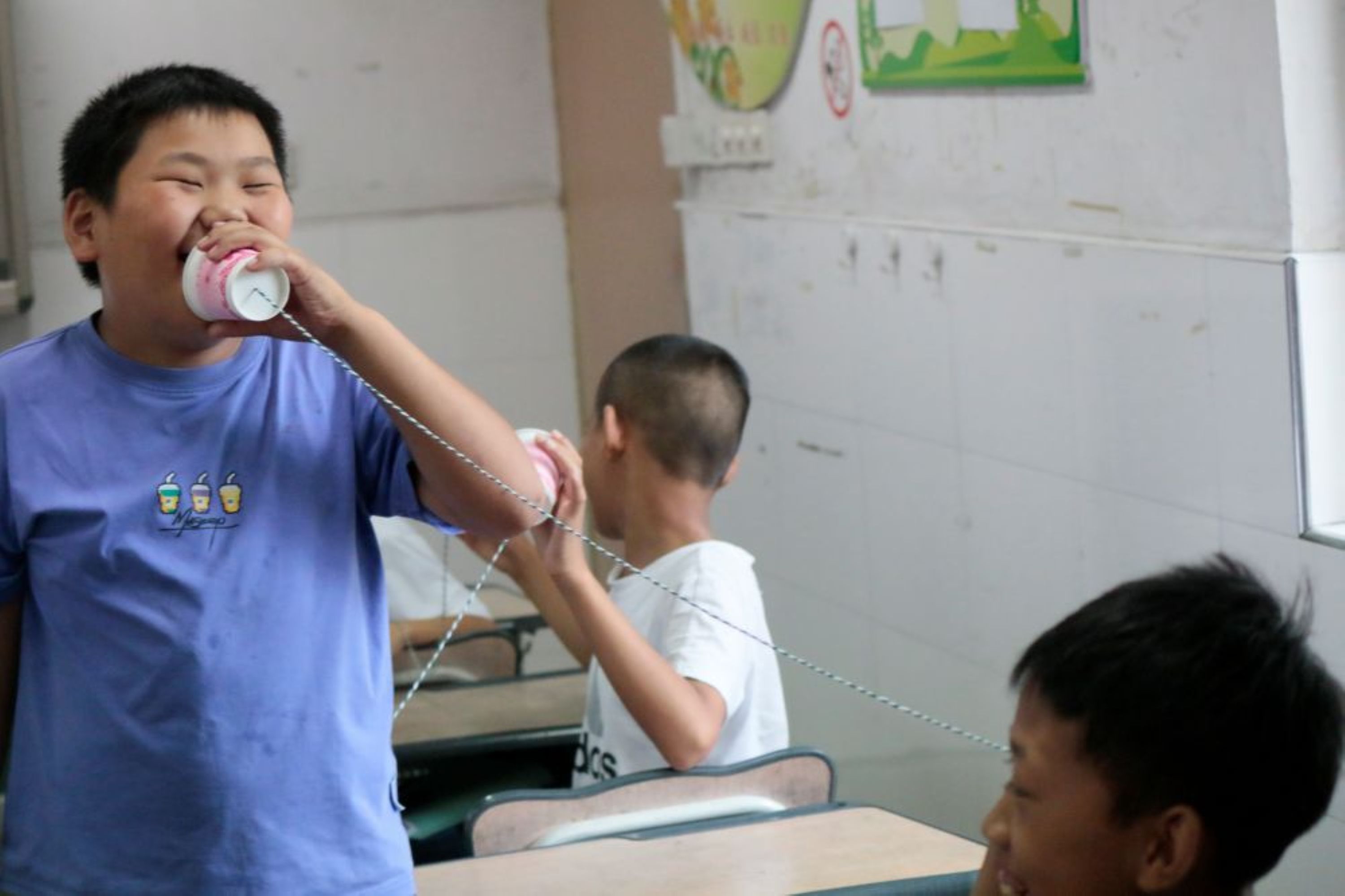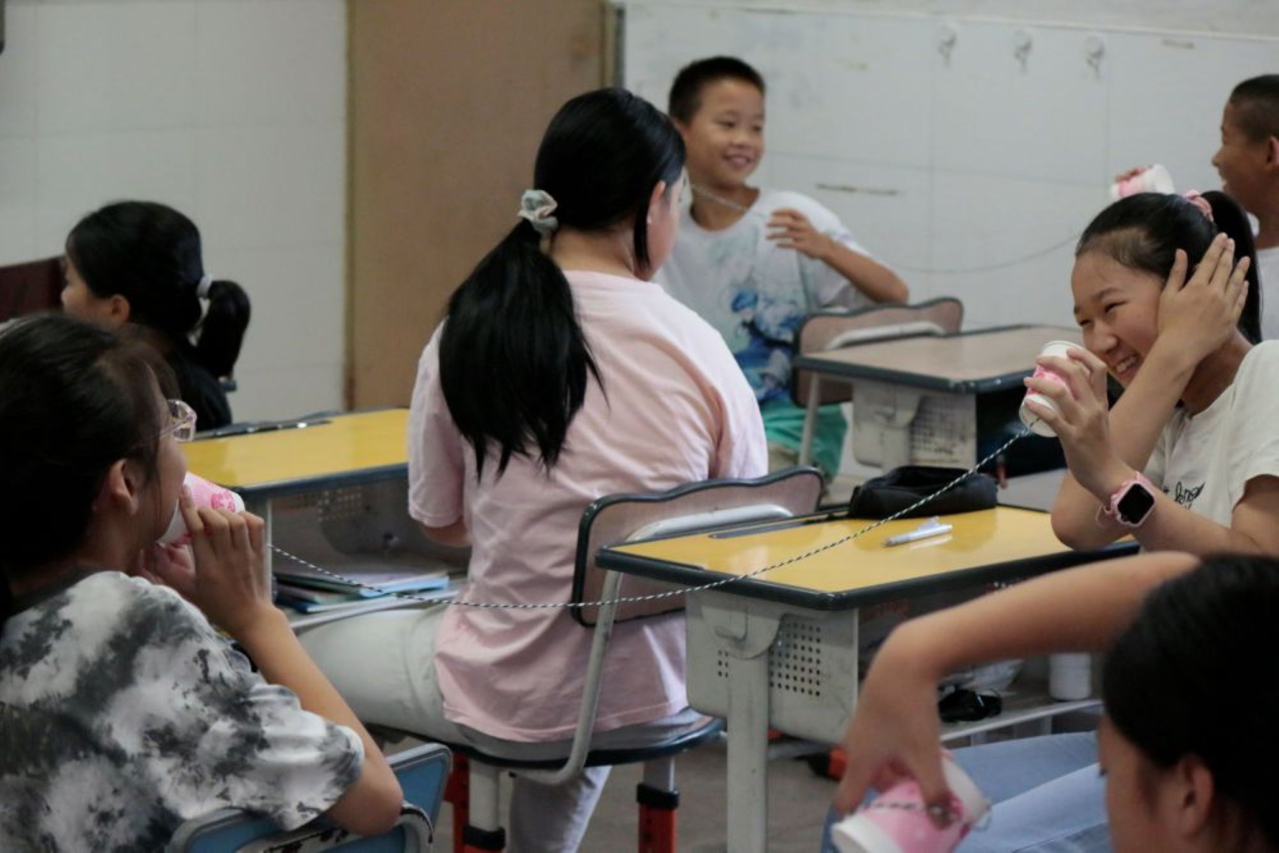 “同學們,今天咱們要利用這個‘會傳聲音的小電話’,再用它玩成語游戲!” 志愿者嚴靜雪話音剛落,孩子們便圍攏過來。活動伊始,志愿者們分發(fā)紙杯,讓同學們試試能不能利用“電話”來傳遞聲音,當?shù)谝粚髀曂岔懫鹎逦?“喂 ——” 聲時,教室里炸開了驚喜的呼喊,這份親手創(chuàng)造的 “魔法”,瞬間拉近了孩子們與知識的距離。