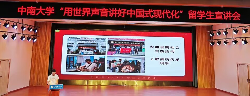 中南大學土木工程學院團支部赴長沙市開福區茶子山村“講好中國故事”國際學生專項暑期社會實踐團成員邵艾卜圍繞源遠流長的湖湘文化、青春活力的長沙、湘繡文化的保護與傳承、家鄉也門的文化與中國文化等方面講述中國式現代化的精彩故事,用希望的旋律編織了美好的未來,用世界聲音傳遞中國式現代化,用自己對湘繡文化的理解和社會實踐得來的感悟,喚起了中學生們對湖湘文化的濃厚興趣。他展現了湘繡的瑰麗與精湛,傳遞了湘繡文化傳承的重要意義和社會實踐的深刻內涵。